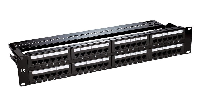 Bản đấu nối cáp đồng có 48 có thanh quản lý cáp, rộng 2U, khung bằng kim loại dùng cho chống nhiễu, không bao gồm Modular Jack